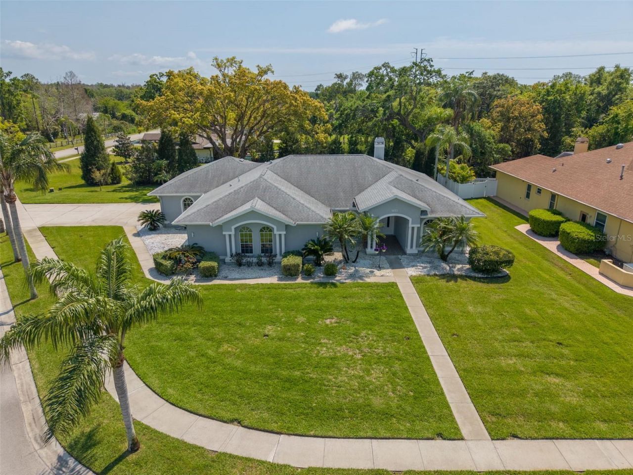 EXTRA EXTRA read all about it! Rare opportunity in Palm Harbor! Have you been looking for a quiet serene home within 5-10 minutes of the beach, shopping, downtown and restaurants? Then make an appointment for this exceptional home that is set on an expansive corner lot just shy of half an acre, with privacy, space, and abundant upgrades throughout. Surrounded by lush landscaping, swaying palm trees, and a peaceful wooded backdrop, the setting feels like your own private retreat, yet you're just a quick golf cart ride to downtown Palm Harbor and Ozona, where you can enjoy local restaurants, shopping, live music, and more. With only 20 homes in the community, this property offers space and exclusivity without sacrificing location. Inside, an open, light-filled layout features soaring cathedral ceilings, expansive windows, and wood plank tile flooring throughout, while a soft, neutral color palette enhances the bright, coastal ambiance. The main living area is truly a showstopper, featuring a stunning granite accent wall with a remote-controlled gas fireplace. Three pocket sliding glass doors fully disappear, seamlessly blending indoor and outdoor living while offering uninterrupted views of the sparkling pool and expansive lanai with the tranquil sound of the pond fountain and views of nature. The kitchen is designed for gathering and entertaining, offering quartz countertops, a spacious island, gas cooktop, stainless steel appliances, and abundant cabinetry. Designer pendant lighting, a beautiful stylish tile backsplash in coastal hues, and a convenient closet pantry complete the space. Best of all, the kitchen overlooks the great room, making it easy to stay connected while hosting. The primary suite is your private sanctuary, featuring dual walk-in custom closets and a spacious en suite bathroom complete with a soaking tub and a large stand-alone shower. The guest bedrooms are generously sized with ample closet space, while the guest bathroom offers a walk-in shower for added comfort and convenience. The entire south end of the home has views of the outdoor entertainment pool lanai area! Step outside to your own private oasis, where the pool was beautifully refinished in 2026 (19K), with tropical blue tones, and includes a shallow bench seating area for relaxing seating 6+. The expansive 1,300-square-foot screened lanai provides ample room for lounging, dining, grilling and entertaining year-round. Additional highlights include a massive three-car garage with epoxy flooring 2025, plantation shutters throughout 2021, a whole-house generator connected to natural gas 2022, and a large interior laundry room with a utility sink and storage cabinets. HVAC SYSTEM 2021, NEW ROOF 2019, NEW Interior wood plank tile flooring 2020, Water Heater 2020, Dish washer, Water Softener, all 2021, Pool Deck Stamping 2021, Granite Wall Gas Fireplace 2022, Pool Pump 2023, Permanent Accent Holiday outdoor lighting with remote control 2025, Security System & Camera's 2025, Pool Refinished 2026, Custom Hurricane shutters and hurricane screen for lanai, Fenced in yard, Corner lot close to a 1/2 Acre all in a NON FLOOD ZONE! With space, privacy, thoughtful upgrades, and an unbeatable location, this home delivers the very best of Florida living. Schedule your private showing today!